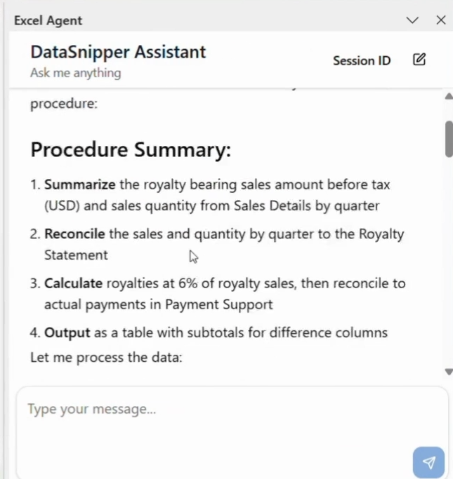 Once the procedure finishes, the Excel Agent will provide a detailed summary of the actions completed.