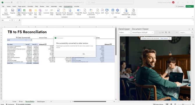 - Click on the “Convert the file to old version” button in the DataSnipper ribbon and convert the file to an older version.
