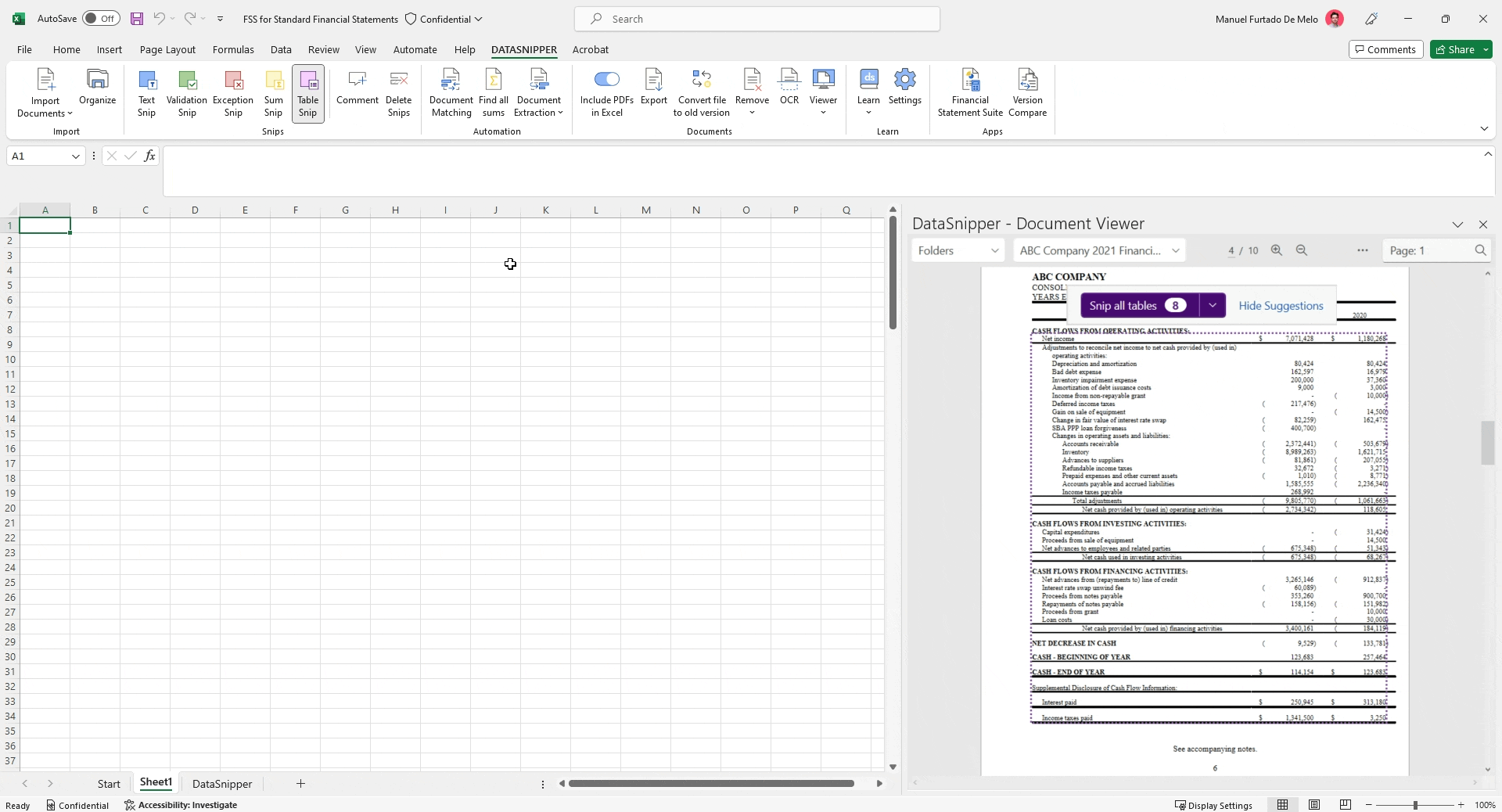 In version 6.0, DataSnipper automatically provides a banner indicating all tables in the documents and the choice to snip these all at once into your workbook, regardless of tables layout. With a single click of a button, the tables are extracted into your Excel workbook. You can seamlessly edit the columns and rows by simply dragging them to the desired location.