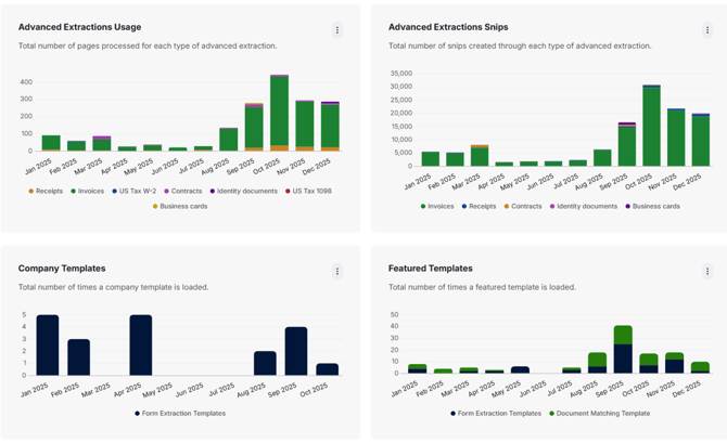 You can also see the overall Automated Snips created. This chart shows the total number of automated Snips created when users run the Document Matching, Form Extraction, Find All Sum Snip and Advanced Document Extraction features. The same applies to Table Snips, DocuMine, Advanced Extraction usage and Templates.