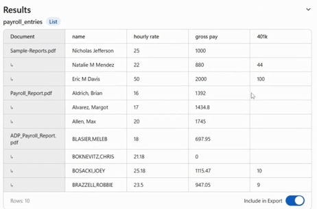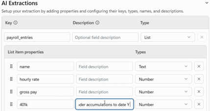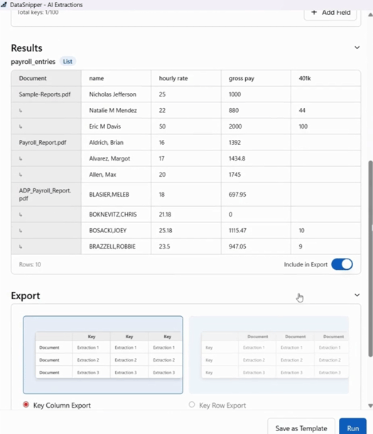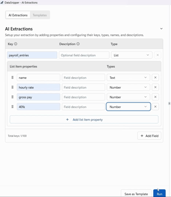 Add each property you want to extract—for example: Name, Hourly Rate, Gross Pay, 401(k). For each property, set the appropriate data type (Text, Number, Date, or Time). And click Run at the bottom of the screen.